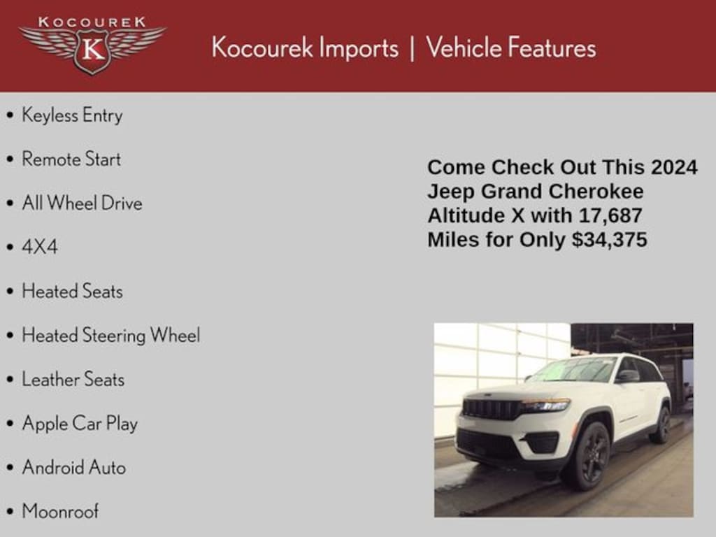 Keyless Entry, Remote Start, All Wheel Drive, 4X4, Heated Seats, Heated Steering Wheel, Leather Seats, Apple Car Play, Android Auto, Moonroof, Trailer Hitch, Tow Package, Trailer Package, Bluetooth, Portable Audio Connection, Backup Camera, Multi-zone Climate Control, 115V Auxiliary Power Outlet, 180 Amp Alternator, 4-Wheel Disc Brakes, 6 Speakers, 7 & 4-Pin Wiring Harness, ABS brakes, Air Conditioning, Altitude X, Anti-whiplash front head restraints, Automatic Headlamp Levelling System, Automatic temperature control, Black Headliner, Bumpers: body-color, Capri Leatherette/Suede Seats, Class IV Receiver Hitch, Cloth Seats, Compass, Delay-off headlights, Delete Laredo Badge, Driver door bin, Driver vanity mirror, Dual front impact airbags, Dual front side impact airbags, Emergency communication system, Four wheel independent suspension, Front anti-roll bar, Front Bucket Seats, Front Center Armrest w/Storage, Front dual zone A/C, Front reading lights, Fully automatic headlights, Gloss Black Exterior Accents, Heated door mirrors, Heated Front Seats, Heated Steering Wheel, Heavy-Duty Engine Cooling, Illuminated entry, Knee airbag, Low tire pressure warning, Normal Duty Suspension, Occupant sensing airbag, Outside temperature display, Overhead airbag, Overhead console, Panic alarm, ParkView Rear Back-Up Camera, Passenger door bin, Passenger vanity mirror, Power door mirrors, Power driver seat, Power Liftgate, Power steering, Power Sunroof, Power windows, Quick Order Package 22M Altitude X (DISC), Radio data system, Radio: Uconnect 5 w/8.4" Display, Rain Sensitive Windshield Wipers, Rear anti-roll bar, Rear Load Levelling Suspension, Rear reading lights, Remote keyless entry, Remote Start System, Security system, Selectable Tire Fill Alert, Speed control, Speed-Sensitive Wipers, Spoiler, Steering wheel mounted audio controls, Tachometer, Telescoping steering wheel, Tilt steering wheel, Trailer Hitch Zoom, Trailer Tow Package, Trip computer, Voltmeter, Wheels: 18" x 8" Fully Painted Aluminum 1, Wireless Charging Pad, 3.45 Rear Axle Ratio, Alloy wheels, Brake assist, Electronic Stability Control, Rear window defroster, Rear window wiper, Split folding rear seat, Traction control, Variably intermittent wipers, Wheels: 17" x 6.5" Fully Painted Aluminum, Wheels: 20" x 8.5" Gloss Black Painted Aluminum, 115V Auxiliary Power Outlet, 180 Amp Alternator, 4-Wheel Disc Brakes, 6 Speakers, 7 & 4-Pin Wiring Harness, ABS brakes, Air Conditioning, Altitude X, Anti-whiplash front head restraints, Automatic Headlamp Levelling System, Automatic temperature control, Black Headliner, Bumpers: body-color, Capri Leatherette/Suede Seats, Class IV Receiver Hitch, Cloth Seats, Compass, Delay-off headlights, Delete Laredo Badge, Driver door bin, Driver vanity mirror, Dual front impact airbags, Dual front side impact airbags, Emergency communication system, Four wheel independent suspension, Front anti-roll bar, Front Bucket Seats, Front Center Armrest w/Storage, Front dual zone A/C, Front reading lights, Fully automatic headlights, Gloss Black Exterior Accents, Heated door mirrors, Heated Front Seats, Heated Steering Wheel, Heavy-Duty Engine Cooling, Illuminated entry, Knee airbag, Low tire pressure warning, Normal Duty Suspension, Occupant sensing airbag, Outside temperature display, Overhead airbag, Overhead console, Panic alarm, ParkView Rear Back-Up Camera, Passenger door bin, Passenger vanity mirror, Power door mirrors, Power driver seat, Power Liftgate, Power steering, Power Sunroof, Power windows, Quick Order Package 22M Altitude X (DISC), Radio data system, Radio: Uconnect 5 w/8.4" Display, Rain Sensitive Windshield Wipers, Rear anti-roll bar, Rear Load Levelling Suspension, Rear reading lights, Remote keyless entry, Remote Start System, Security system, Selectable Tire Fill Alert, Speed control, Speed-Sensitive Wipers, Spoiler, Steering wheel mounted audio controls, Tachometer, Telescoping steering wheel, Tilt steering wheel, Trailer Hitch Zoom, Tra