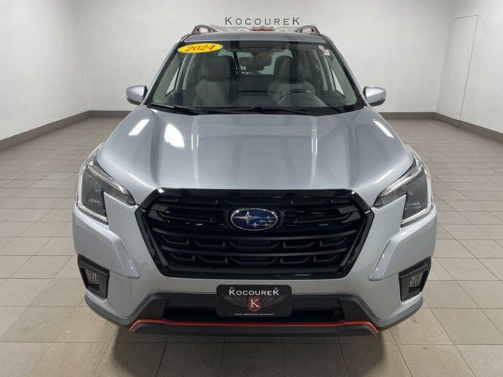 Forester Sport, 4D Sport Utility, 2.5L 4-Cylinder DOHC 16V, Lineartronic CVT, AWD, Ice Silver Metallic, Gray Cloth, 8" Audio w/harman/kardon & RAB & Power Rear Gate, Brake assist, Exterior Parking Camera Rear, Front Bucket Seats, Fully automatic headlights, harman/kardon 9-Speaker Audio System, Heated Front Bucket Seats, Heated front seats, Illuminated entry, Power moonroof: Panoramic, Power Rear Gate, Radio: Subaru STARLINK 8.0" Multimedia Plus System, Reverse Automatic Braking System (RAB), Split folding rear seat, 3.70 Axle Ratio, 4-Wheel Disc Brakes, 6 Speakers, ABS brakes, Air Conditioning, All-Weather Floor Liners, Alloy wheels, AM/FM radio: SiriusXM, Anti-whiplash front head restraints, Auto High-beam Headlights, Auto-Dimming Exterior Mirror w/Approach Light, Auto-Dimming Mirror w/Compass & HomeLink, Automatic temperature control, Bumpers: body-color, Driver door bin, Driver vanity mirror, Dual front impact airbags, Dual front side impact airbags, Electronic Stability Control, Emergency communication system: STARLINK Safety and Security (Subscription Required), Four wheel independent suspension, Front anti-roll bar, Front Center Armrest, Front fog lights, Front reading lights, Heated door mirrors, Knee airbag, Leather Shift Knob, Leather steering wheel, Low tire pressure warning, Occupant sensing airbag, Outside temperature display, Overhead airbag, Overhead console, Panic alarm, Passenger door bin, Passenger vanity mirror, Power door mirrors, Power driver seat, Power steering, Power windows, Radio data system, Radio: Subaru STARLINK 6.5" Multimedia Plus System, Rear anti-roll bar, Rear seat center armrest, Rear window defroster, Rear window wiper, Remote keyless entry, Roof rack: rails only, Security system, Speed control, Speed-sensing steering, Spoiler, Sport Cloth Upholstery, STARLINK/Apple CarPlay/Android Auto, Steering wheel mounted audio controls, Tachometer, Telescoping steering wheel, Tilt steering wheel, Traction control, Trip computer, Turn signal indicator mirrors, Variably intermittent wipers, Wheels: 18" x 7.0 J Black Finish Aluminum-Alloy, Forester Sport, 4D Sport Utility, 2.5L 4-Cylinder DOHC 16V, Lineartronic CVT, AWD, Ice Silver Metallic, Gray Cloth, 8" Audio w/harman/kardon & RAB & Power Rear Gate, Brake assist, Exterior Parking Camera Rear, Front Bucket Seats, Fully automatic headlights, harman/kardon 9-Speaker Audio System, Heated Front Bucket Seats, Heated front seats, Illuminated entry, Power moonroof: Panoramic, Power Rear Gate, Radio: Subaru STARLINK 8.0" Multimedia Plus System, Reverse Automatic Braking System (RAB), Split folding rear seat.