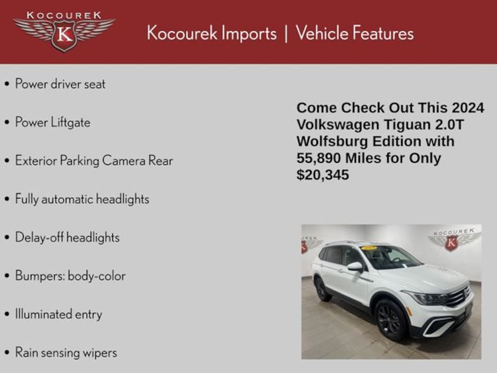 Please call one of our knowledgeable Sales Consultants with any question you might have. Serving guests in Marathon, Portage, Langlade, Oneida, Taylor, Vilias, Wood, Clark, Lincoln, Waupaca or near me! 2024 Volkswagen Tiguan 2.0T Wolfsburg Edition
